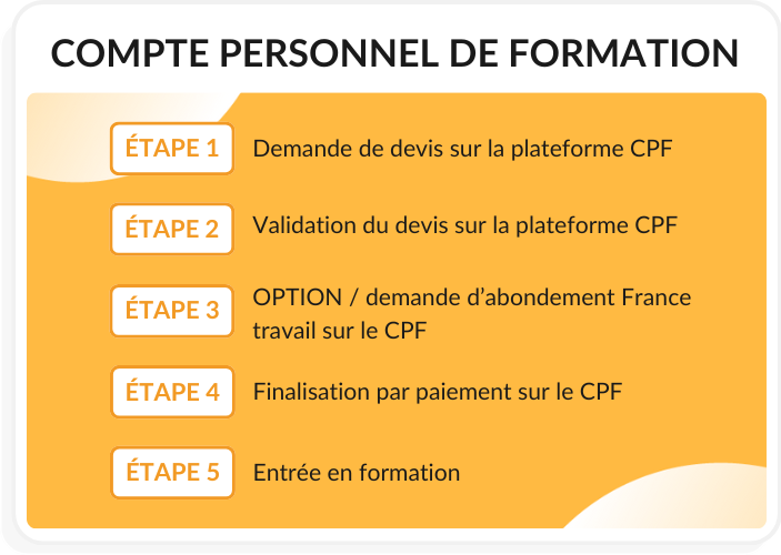 - Étape 4 : Paiement : Si votre solde CPF ne couvre pas l'intégralité des frais, vous pouvez compléter via d'autres moyens de financement.