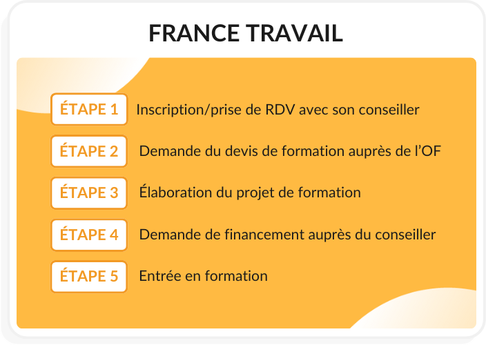 - Étape 4 : Demande de financement auprès du conseiller : votre conseiller France Travail peut abonder certains financements comme le CPF, selon votre profil et l'enveloppe financière disponible.