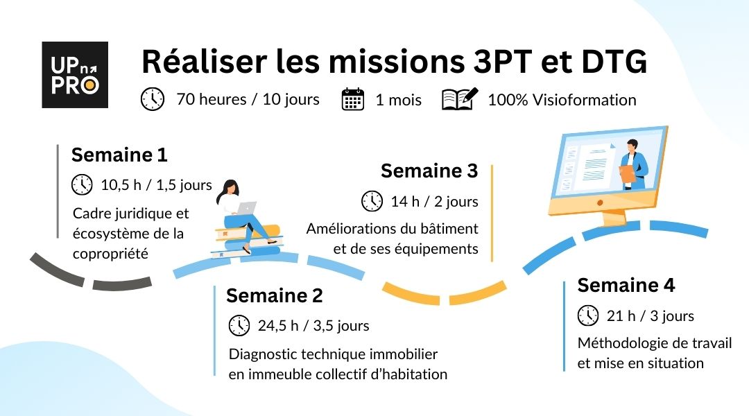 Pour répondre à ces nouveaux besoins, Up n’PRO a conçu une formation DTG PPPT "Réaliser les missions 3PT et DTG", 100 % à distance en visioformation, spécialement pensée pour les professionnels souhaitant devenir signataires de ces rapports conformément à la réglementation.